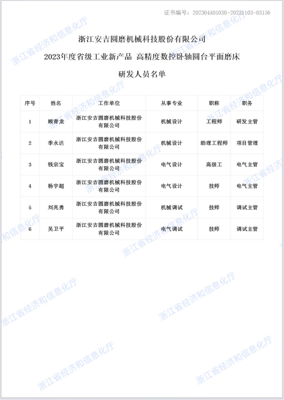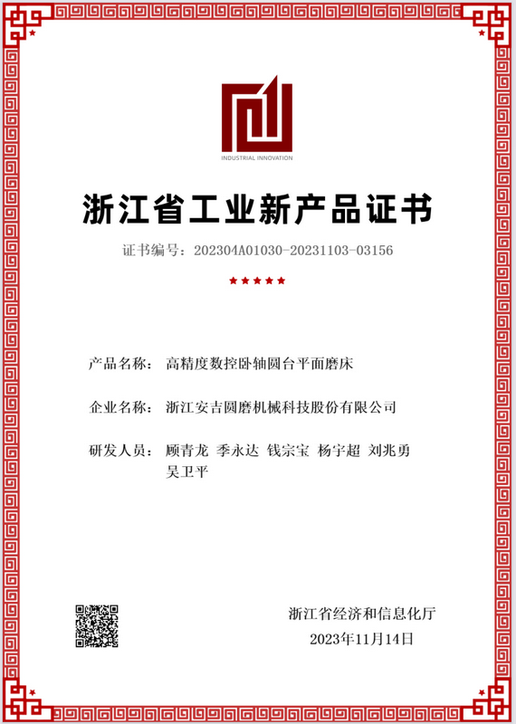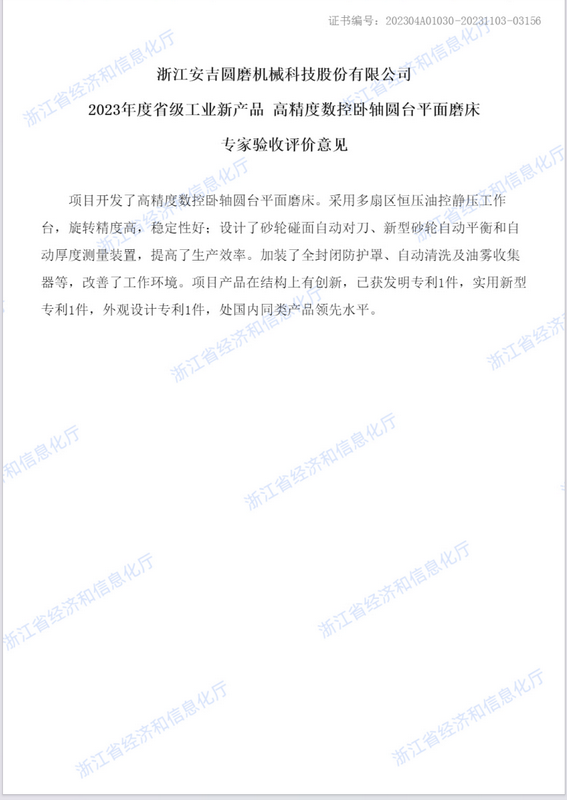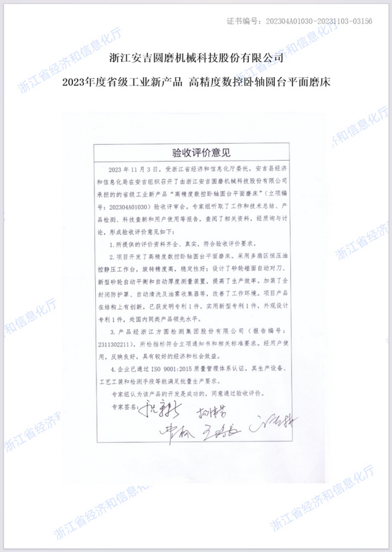 • 高精度數(shù)控臥軸圓臺(tái)平面磨床新產(chǎn)品評(píng)價(jià)證書